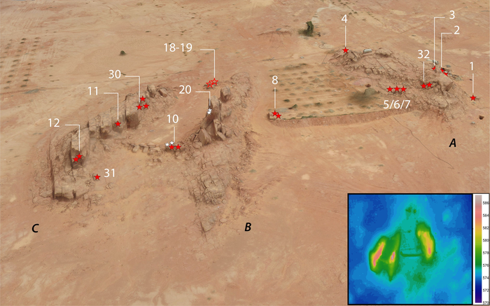 The Camel site, viewed from north-west, showing the position of all large reliefs (red stars), small reliefs (white stars) and large fragments (stars with red outline)