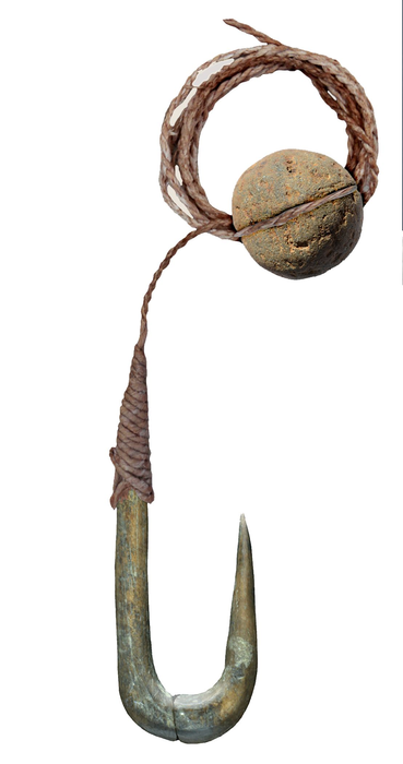 IMAGE: A RECONSTRUCTION OF A HOOK & SMALL GROOVED PEBBLE ON A LINE. NOTE THE SOPHISTICATED KNOT. view more