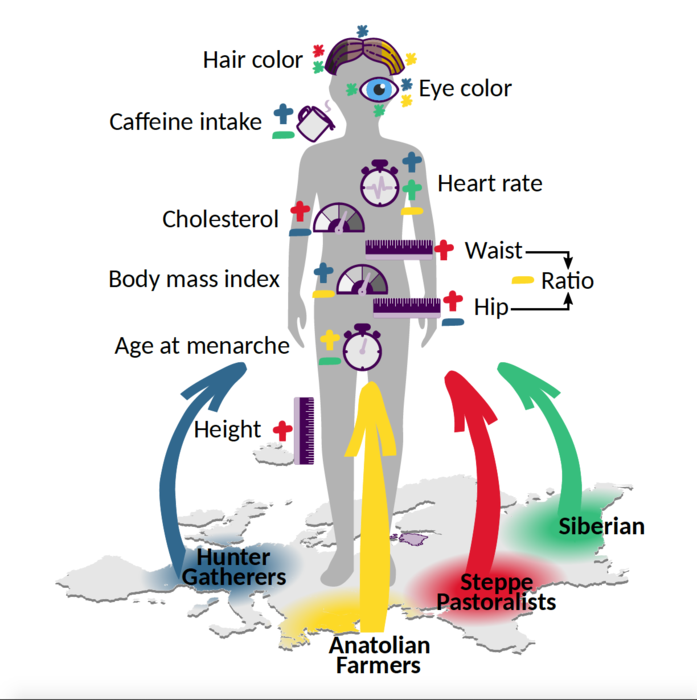 “Our results show that the ancient populations that formed contemporary Europeans were differentiated enough to contribute their own signature to the physiology and appearance of contemporary individuals,” says Prof. Luca Pagani, senior author of the study. For example, Steppe ancestry seems to have contributed to a strong build, with tall stature and increased hip and waist circumferences, but also to higher blood cholesterol, which on the other hand tends to be lower in individuals carrying Hunter-Gatherer ancestry at specific genes. The latter seems also linked with higher body mass index (BMI), among others. The best connections made for the Anatolian ancestry are instead a reduced (BMI-corrected) waist-hip ratio and lower heart rate.