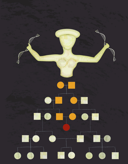 IMAGE: THE WELL-KNOWN FIGURE OF A MINOAN GODDESS, ARTISTICALLY APPROPRIATED AND DEPICTED HOLDING DNA CHAINS INSTEAD OF SNAKES. THE POPULATION IS BORN FROM HER "ANCIENT" BODY. THE ORANGE AND RED GENEALOGY REFERS TO THE RESEARCH FINDING OF ENDOGAMY BETWEEN FIRST AND SECOND COUSINS. view more