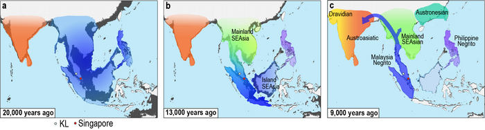 IMAGE: FIGURE A: A PALEOGEOGRAPHIC MAP OF SOUTH ASIA AND THE SUNDALAND IN SOUTHEAST ASIA OVER 20,000 YEARS AGO. THESE LANDS WERE OCCUPIED BY THEIR RESPECTIVE EARLIEST SETTLERS. FIGURE B: RISING SEA LEVEL FLOODED THE SUNDALAND, REDUCED THE LAND AREA AND CAUSED LAND SPLITS INTO SMALLER ISLANDS, INFLUENCING MULTIPLE POPULATION DISPERSAL AND POPULATION SURGE, ESPECIALLY IN THE ISLAND SOUTHEAST ASIAN REGION. FIGURE C: OVERPOPULATION IN THE ISLAND SOUTHEAST ASIAN REGION DROVE THE MALAYSIAN INDIGENOUS GROUP (MALAYSIA NEGRITO, OR COMMONLY KNOWN AS ‘ORANG ASLI’) TO MIGRATE BACK NORTHWARDS, TOWARDS MAINLAND SOUTHEAST ASIA AND SOUTH ASIA. view more