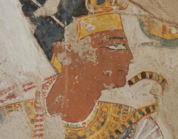 IMAGE: PORTRAIT OF RAMSES II FROM TOMB OF NAKHTAMON (C. 1,200 BCE). THE HEADDRESS, NECKLACE, AND ROYAL SCEPTRE WERE TOUCHED UP DURING THE PAINTING’S EXECUTION. view more