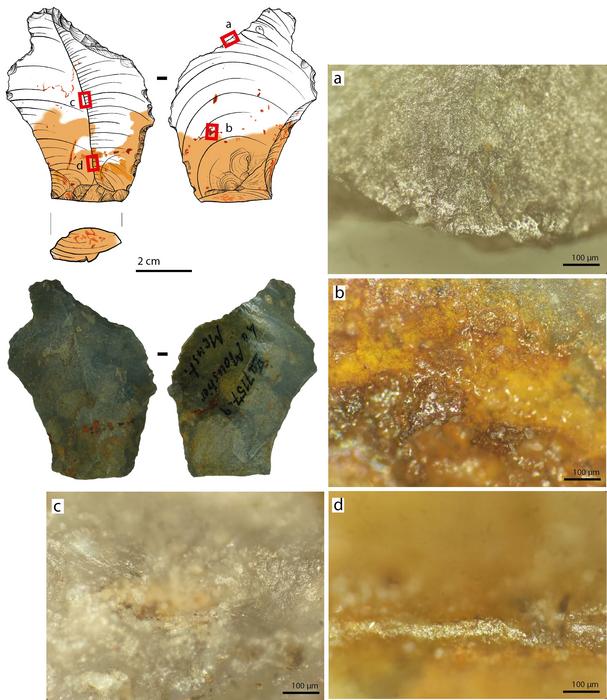 The researchers discovered traces of a mixture of ochre and bitumen on several stone tools, such as scrapers, flakes, and blades. Ochre is a naturally occurring earth pigment; bitumen is a component of asphalt and can be produced from crude oil, but also occurs naturally in the soil.