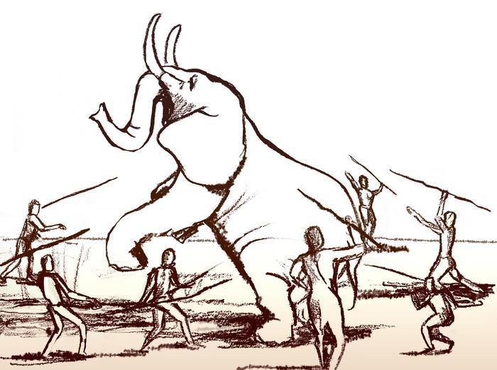 ILLUSTRATION OF ELEPHANT HUNTING USING SPEARS BY DANA ACKERFELD