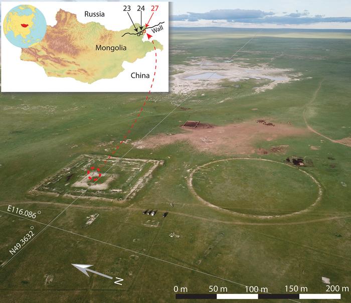 Drone photo of Cluster 27 in northeastern Mongolia. A red circle marks the location of the excavated burial. The inset map shows the location of Cluster 27 in red and two other enclosure sites along the long wall (Clusters 23 and 24) in black.