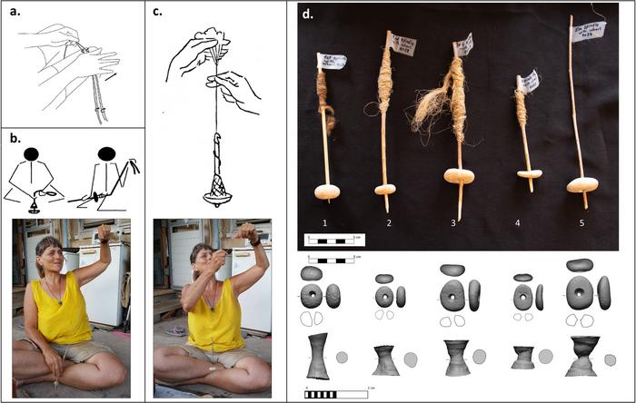 Spinning methods. (a) Manual thigh-spinning [64]; (b) Spindle-and-whorl “supported spinning” [68]; (c) “drop spinning” [66]; (d) the experimental spindles and whorls, the 3D scans of the pebbles and their negative perforations. The bottom pictures show Yonit Kristal experimenting spinning fibres with replicas of the perforated pebbles, using supported spinning and drop spinning techniques (photographed by Talia Yashuv).