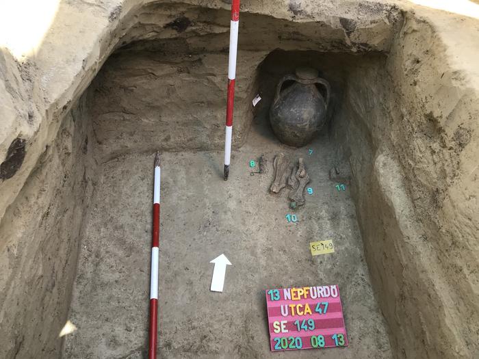 Excavation photo of the Hun-period “eastern-type” burial from Budapest, Népfürdő Street (Hungary).