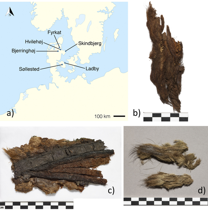 Map of studied sites (a) and examples of included fur: b) Hvilehøj C4273-97, fragment 1, c) Hvilehøj C4280c, d) Bjerringhøj C143. Graphics: Luise Ørsted Brandt and Charlotte Rimstad. Photos: Roberto Fortuna, National Museum of Denmark.