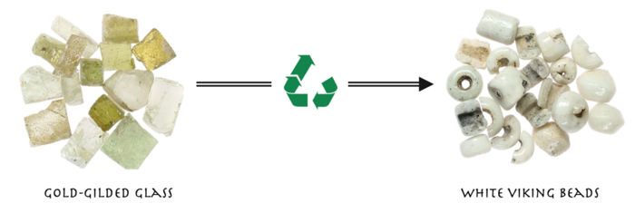 The chemical composition of white Viking beads from one of the earliest workshops showed that the glassmakers had found a more sustainable way to save time and wood for their furnaces: crush gold-gilded, transparent glass cubes, remelt them at low temperature, stir to trap air in the form of bubbles, and finally wrap the glass around an iron mandrel to form beads and voila! - opaque white beads created in a short time using a minimum of resources.