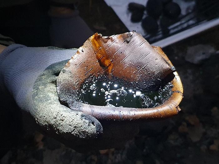 IMAGE: RAISED STRUCTURE TAR – BIRCH BARK TAR VESSEL CONTAINING HOT TAR FROM A RECENTLY COMPLETED EXPERIMENT USING THE ‘RAISED STRUCTURE’ TECHNIQUE. view more